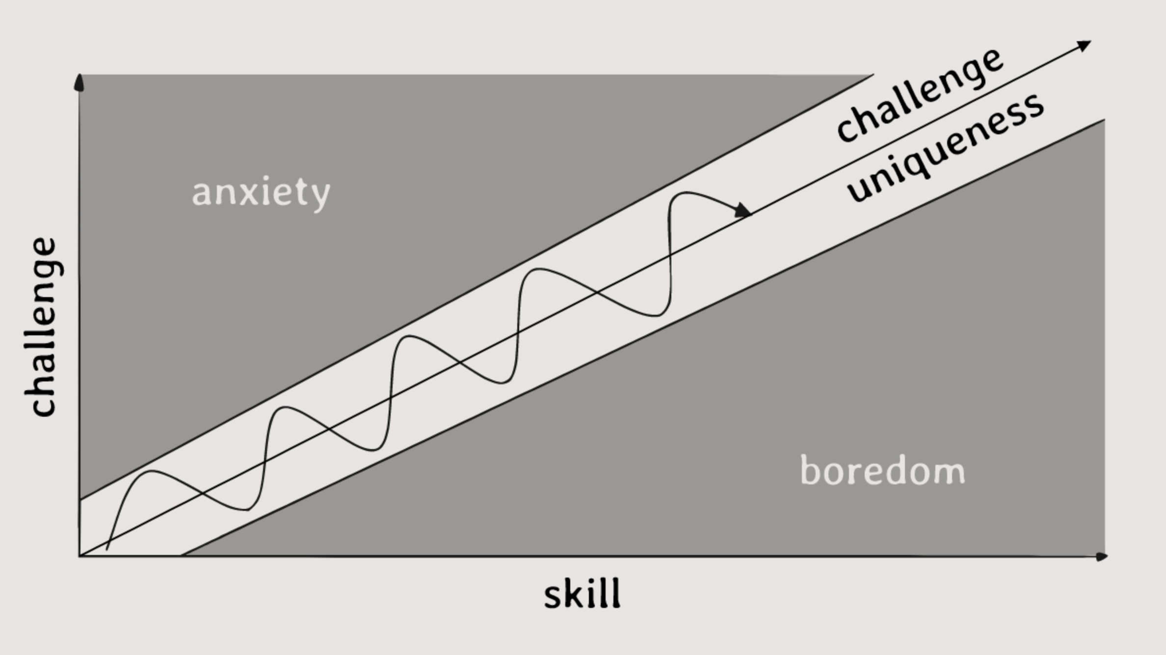 To illustrate the concept, let's modify Jesse's diagram in this chapter to include the challenge uniqueness axis within the flow channel. It lies there since we: